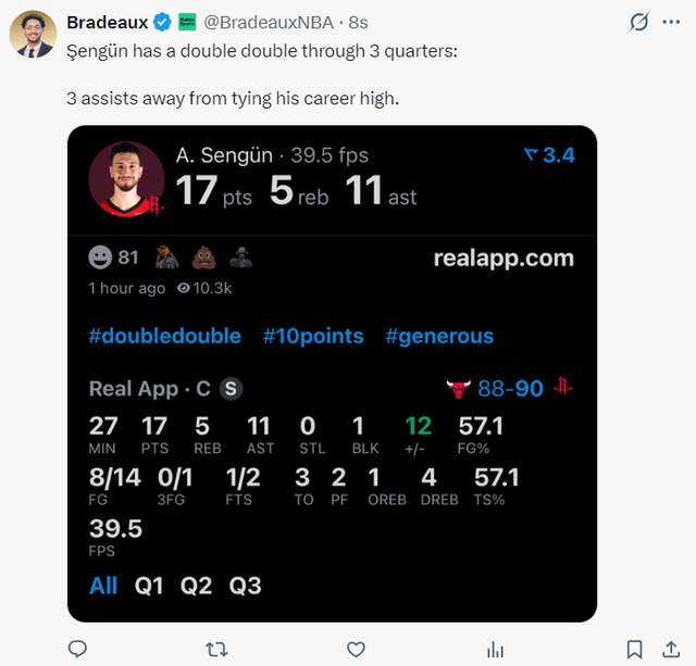 在火箭三连客吞下三连败后,杜兰特、申京两人都遭到了诸多的批判,不少的火箭球迷将球队的低迷归罪于这两位核心。火箭记者Bradeaux晒出杜兰特本赛季场均26.1+5.3+4.5+0.6+1的数据、申京场均21.7+9+6.4+1.5+1的数据力挺两人。