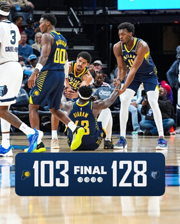 在上一场比赛惨败给热火32分之后,灰熊今天背靠背在主场以128-103大胜步行者,净胜25分。上赛季打进了总决赛的步行者在哈利伯顿伤停,又失去了特纳的情况下,开局先后输给雷霆和灰熊,遭遇了两连败。