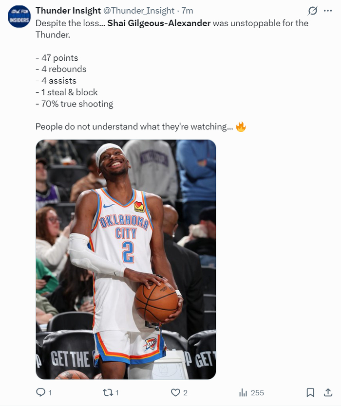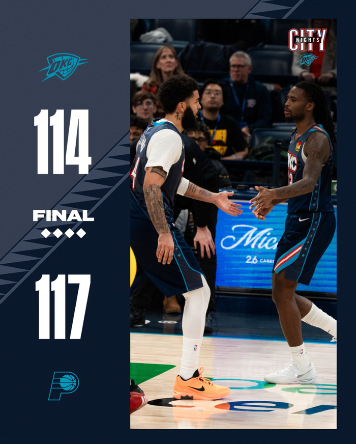 最终步行者5人上双+三人20+暴打雷霆,OKC这边只有两人20+,SGA在末节狂砍15分,全场比赛35分钟,28中17,三分4中1,罚球12中12拿到47分4篮板4助攻1抢断1盖帽,命中率60.7%,真实命中率70.6%,正负值+4。