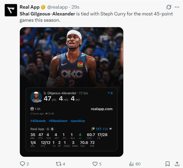 此役SGA创造多项纪录:1.这场比赛SGA延续了自己连续116场20+;